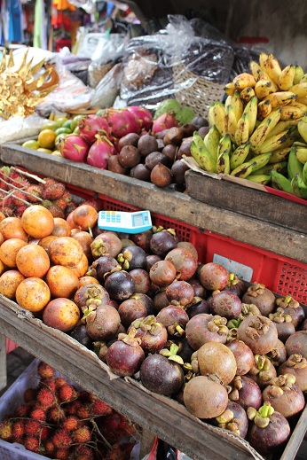 今の時期は雨期なので、たくさんのフルーツが市場に並んでいます