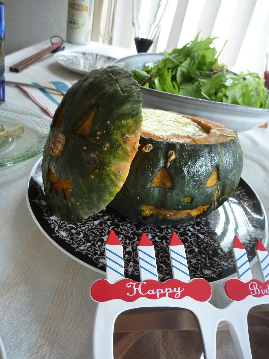 カプレーゼ、塩豚を煮ただけ、ハロウィンも近いのでかぼちゃ丸焼き(中はホウレンソウのグラタン風)・・・etc。