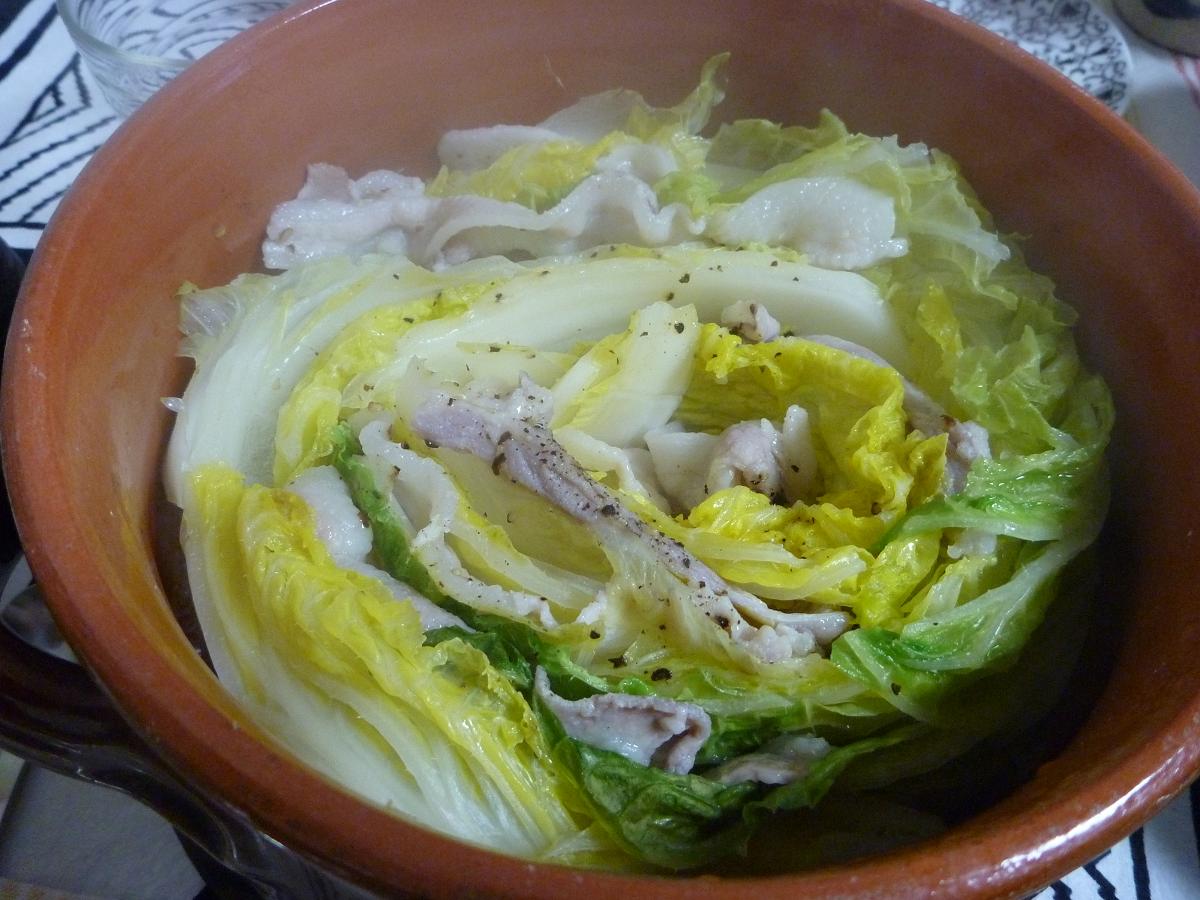 白菜と豚バラの蒸し鍋 白菜に豚バラ肉をはさんで、 適当にお酒と塩と胡椒を振りかけて、蒸すだけ! お肉に火がとおって、しんなりしたら出来上がり ポン酢と柚子胡椒でいただきました~ ヘルシーで美味しくて最高! 主人にも好評! ゆきさん ありがとう~
