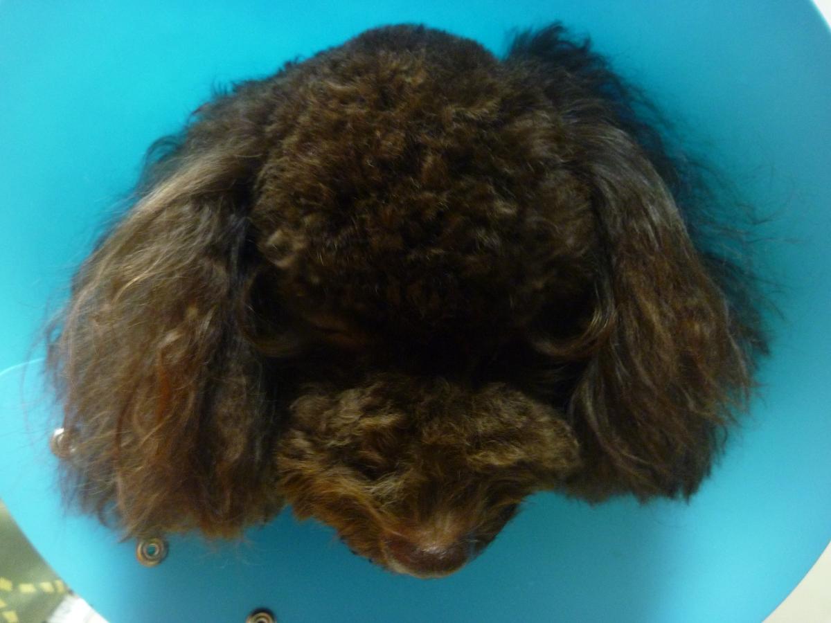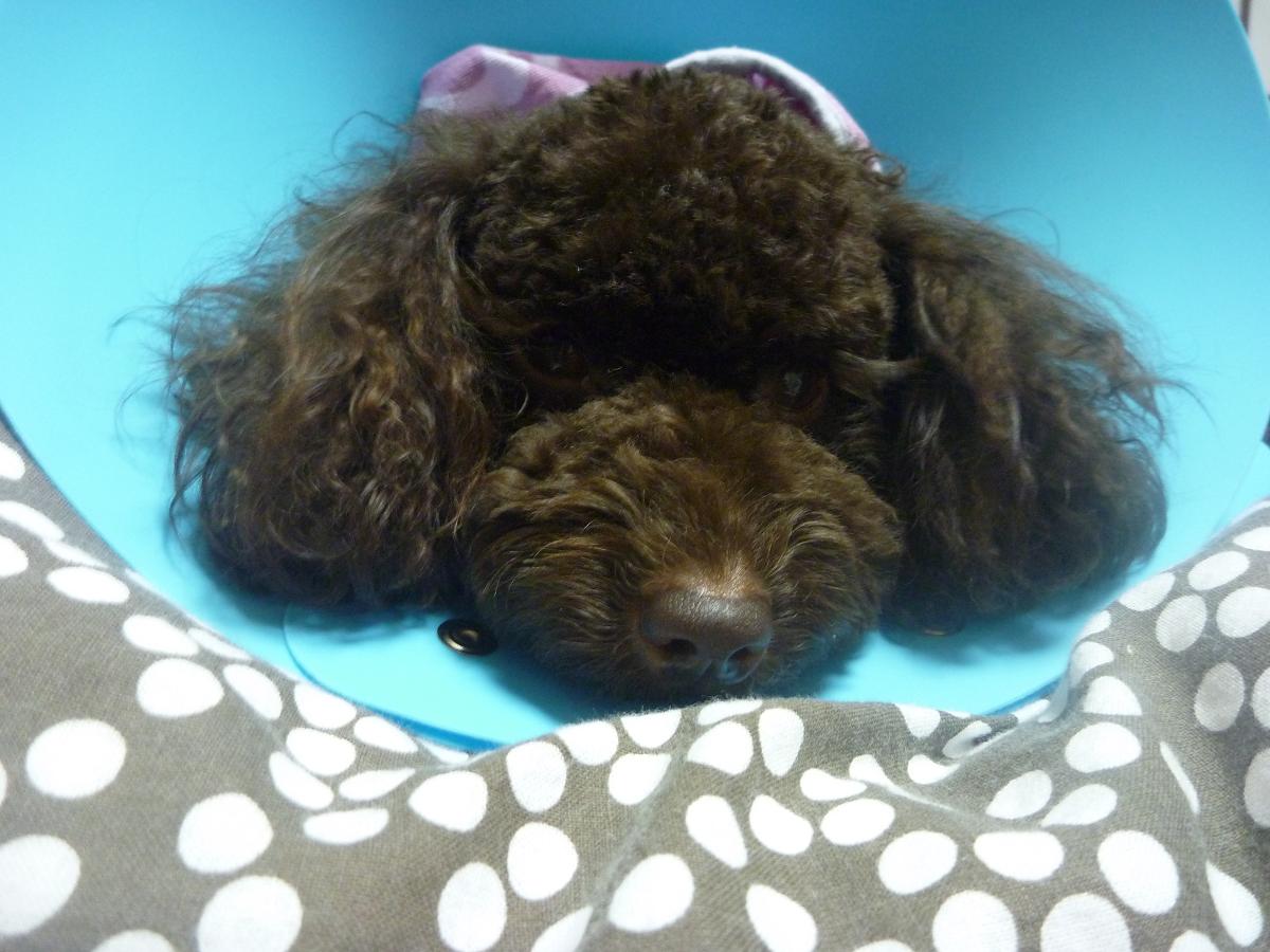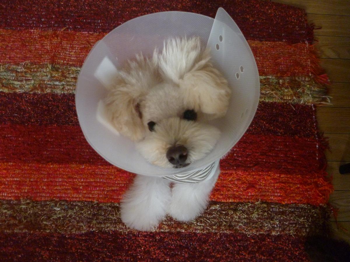 papicoのお肌を守るため、メイ兄さんのエリザベスカラーを
