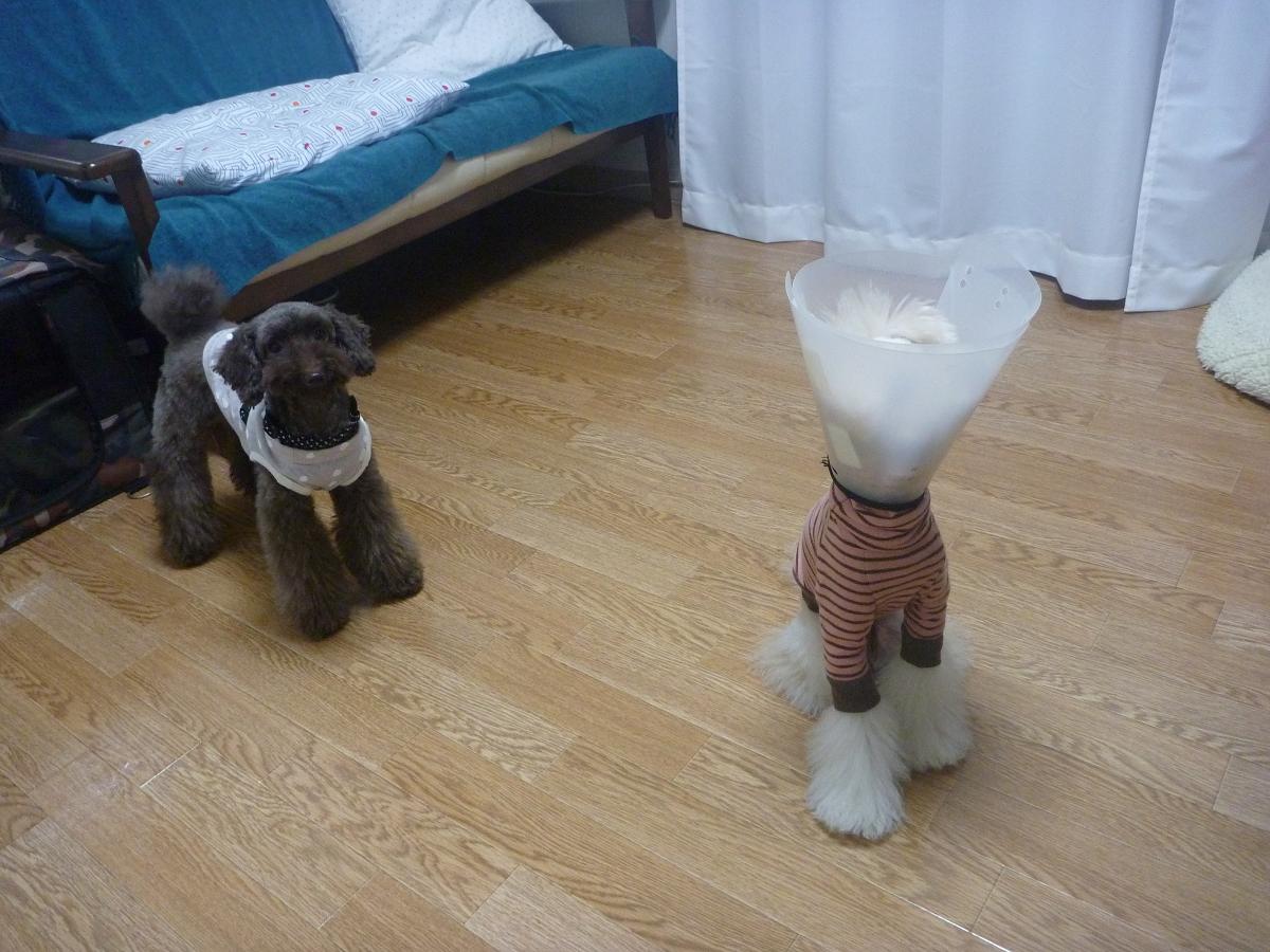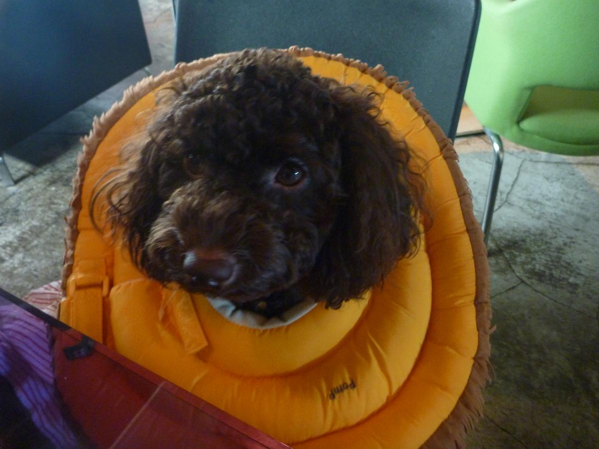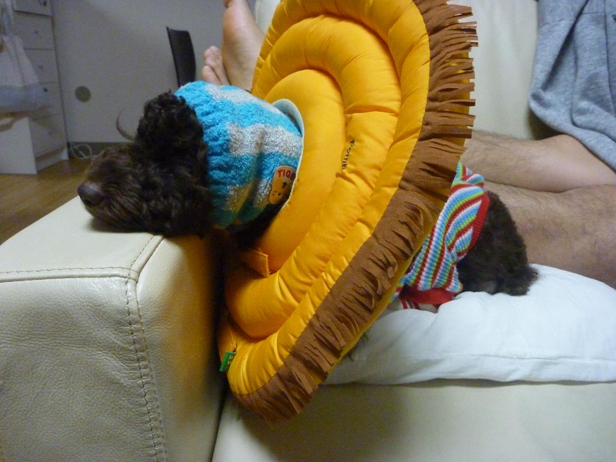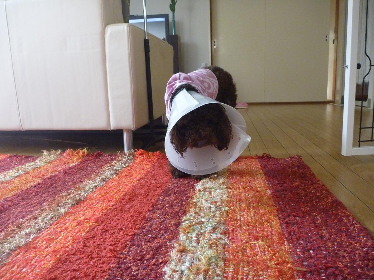 papicoのお肌を守るため、メイ兄さんのエリザベスカラーを