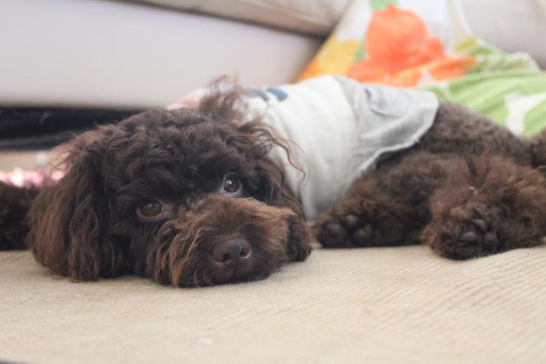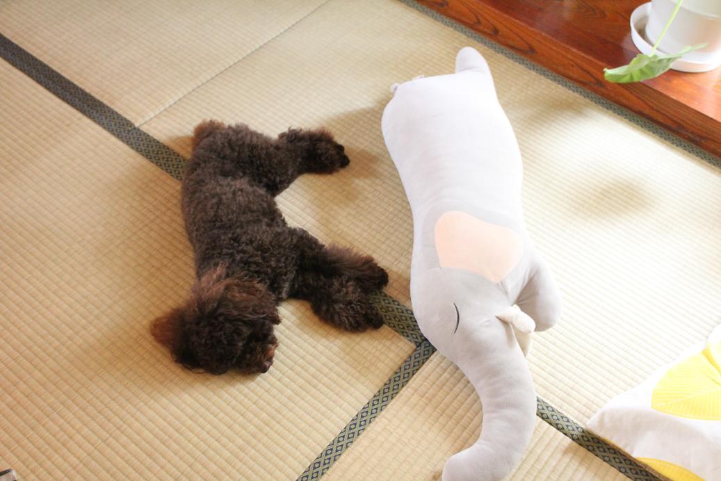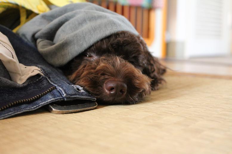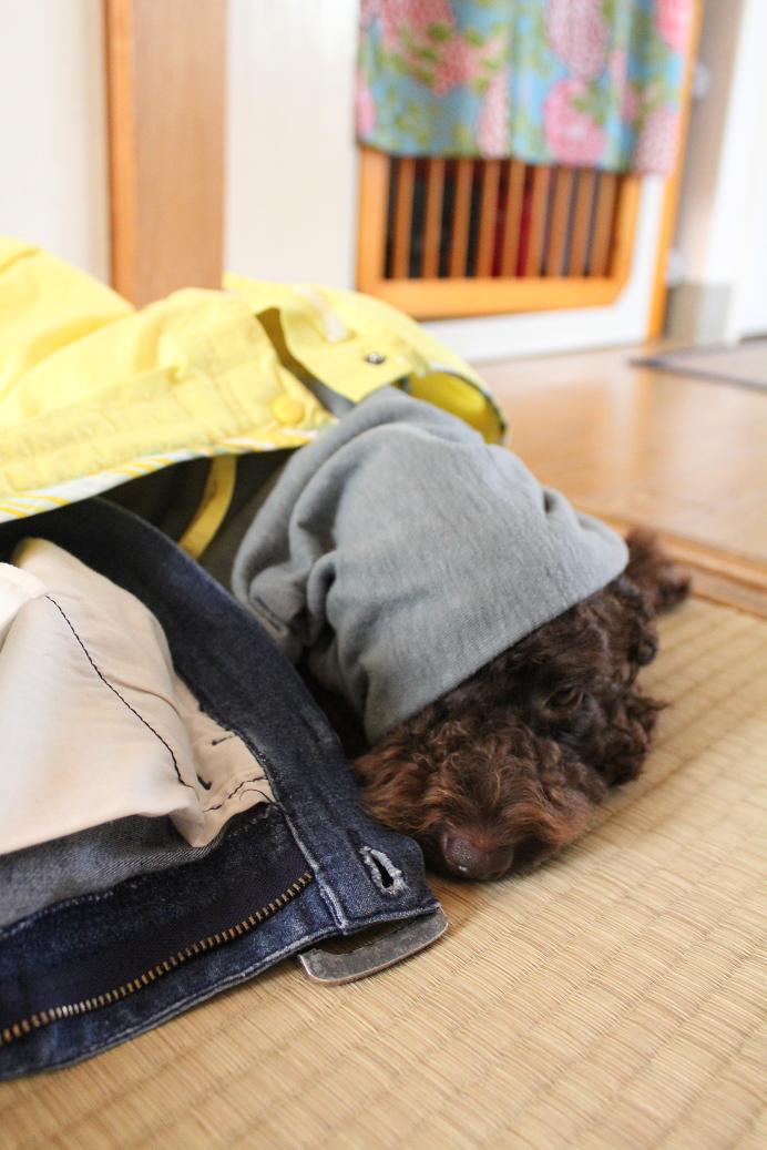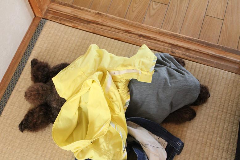 papicoが近くにいたので、洗濯物の服をかけてみました・・・ なんだか落ち着いています・・